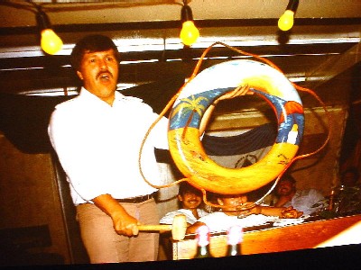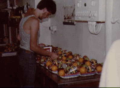 Ich hatte das große Glück einen verständnissvollen Koch (Uwe Bratz) an meiner Seite zu haben, der mich in die Gepflogenheiten und Bräuche der christlichen Seefahrt eingearbeitet hat. Denn einiges ist doch ganz anders als an Land. Das geht schon mit den Ausdrücken los. Ein Eimer ist eine „Pütz“, Abfall ist „Fuhlbrass“, Türen sind „Schotten“, Proviantlager sind „Lasten“, Treppen sind „Niedergänge“, die Kantine ist eine „Pantry“, der Speisesaal eine „Messe“, Serviererinnen sind „Stewardessen oder Miezen“ und so weiter. Das gilt auch für die Feiertage. So ist z.B. außer dem normalen Sonntag jeder Donnerstag „Seemannssonntag“. Das bedeutet für den Bäcker Donnerstag und Sonntag Kuchen backen für die „Coffeetime“ Das hieß also Dienstag, Donnerstag und Sonntag war die Nacht so gegen 3 Uhr für mich zu Ende. Nebenbei müssen ja auch noch Brötchen und Brot für genau 42 Besatzungsmitglieder gebacken werden. Bei mir wurde zu jeder Coffeetime ein Wunschkuchen gebacken, d.h. jeder konnte sich mal seinen Lieblingskuchen von mir backen lassen. Das kam auch sehr gut an!(gleich 50,00 Mark der DDR Bordzulage pro Monat für mich)