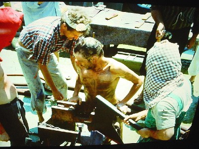 Dann wartete schon der E-Mix mit einer Folterbank, auf die ich geschnallt wurde und jagte mir mit seinem Kurbelgerät ständig Strom durch meinen armen Körper (…und ich Idiot hab am Vortag dieses Kurbelgerät noch getestet und Udo unserem E-Ing. gesagt, dass es nicht funktioniert, da es wirklich keinen Strom von sich gab). Ständig wurden mir irgendwelche Kekse versucht in den Mund zu stecken, die schon rochen wie eine Mischung aus altem Käse und Schweinemist (war eine Glanzleistung unserer Bäckerin Bianca). Man hatte dann aber ein Einsehen, bevor ich die Täufer mit nicht vorhandenem Mageninhalt „anbrüllen“ würde. Danach ging es zum „Frisör“ in Person meines langjährigen Lieblingskollegen Renald Schmidt. Also rein in das 200 Liter Fass voller alter Essenreste. Erst mit dem Kopf, dann der ganze Körper. Am Ende schaute der Kopf noch raus und bekam eine Holzspange (ähnlich des Prangers im Mittelalter), in die beide Hände und der Kopf geklemmt wurden. Nun konnte der „Frisör“ den Kopf nach Lust und Laune bearbeiten. Eine Beschreibung der Frisur ist unmöglich!