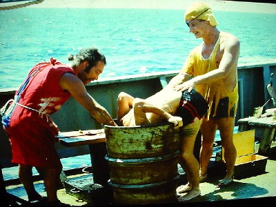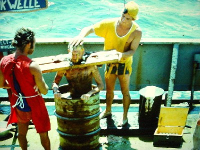 Unter Peitschenhieben (keine Angst die war nicht ganz echt) werde ich den Niedergang raufgetrieben. Immer in demütiger gebückter Haltung vor Neptun. Als erstes bekam ich ein Fisch in den Mund und musste durch ein mit Seewasser gefüllten mit beiden Enden nach oben gerichteten ca. 2m langen Schlauch (Durchmesser war ungefähr 150cm) kriechen um am anderen Ende den Fisch immer noch zwischen den Zähnen haltend unserem Bootsmann Billig vor sein C-Rohr zu laufen, dass natürlich kräftig, schönes salziges Meerwasser von sich gab, natürlich mitten ins Gesicht.
