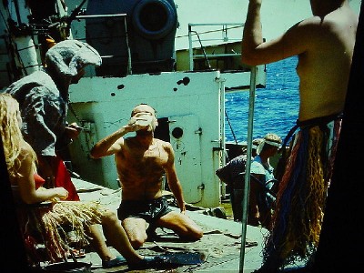 2 Tage vor erreichen des Äquators hat sich das Blatt zunehmend gewendet, die zu Taufenden bitten doch die Täufer das Steak oder das Eis zu nehmen, man könne ja auch mal verzichten. In der Manschaftsmesse steht eine Truhe in der jeder Täufling täglich oder stündlich, je nachdem wie groß die Angst ist, einige Gaben in Form von hangeschriebenen Zetteln einwerfen sollte, was er denn bereit sei zu spendieren um unser aller Wassergott Neptun gnädig zu stimmen. Das geht über eine Schachtel Cabinet, eine Flasche Bier oder ähnliches. Es ist natürlich so, wer eine Flasche Bier oder Schachtel Cabinet spendiert, kann auch ganz schnell in Ungnade fallen, denn solche Kleinigkeiten sieht Neptun als Verar….ung an. Es sollte doch schon ein Kasten Bier oder besser noch Schnaps aus der Transitlast sein.