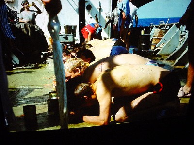 Was ist das…?! Ich liege in der Koje und ein Geschreie geht durch die Gänge. Das Schott wird aufgerissen, und ich werde von zwei Täufern unter Peitschenhieben (aufgeschnittene Festmacherleine in rote Farbe getunkt) aufgefordert, auf allen vieren aufs Hauptdeck zu kriechen und wie ein Hund zu heulen bis der Mond vorkommt! Zu diesem Zweck wurde auf dem hinteren Hauptdeck neben Luke fünf eine weiße Linie gemalt, an der alle Täufer sich hinzuhocken haben. Gott sei Dank, war der Himmel nicht so bewölkt. Also wieder rein in die Kammer.