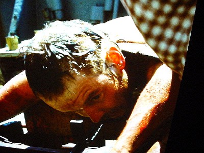 Das ganze Gesindel von Täufern treibt die Meute (ich glaube wir waren 18 Mann inkl. 2 Frauen) nach achtern in den Trockenraum. Dieser befindet sich direkt über der Schiffsschraube und ist wie fast alles auf dem Schiff aus Stahl und hat kein einziges Bulleye (Fenster). Vor dem Niedergang (es ging ja abwärts in den Trockenraum) wartete der E.-Mix mit altem Harzer Käse dessen Haltbarkeitsdatum dem Gestank nach schon vor dem 1. Weltkrieg verfallen war. Nun bekam jeder eine Portion dieser übelriechenden Masse in die Haare geschmiert, wegen der guten Haftung.